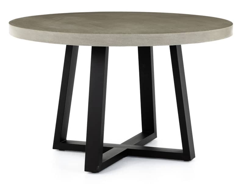 Four Hands VCNS-F006A Constantine Collection 48″ Cyrus Round Outdoor Dining Table In Light Grey & BlackA strikingly simple poly-resin top derived from river sand is polished to a smooth sheen. An angled, matte black iron base adds architectural appeal to this large-scale dining table. Slight color variance is to be expected, and speaks to lava stone’s organic nature. Cover or store indoors during inclement weather and when not in use. From the Constantine Collection |