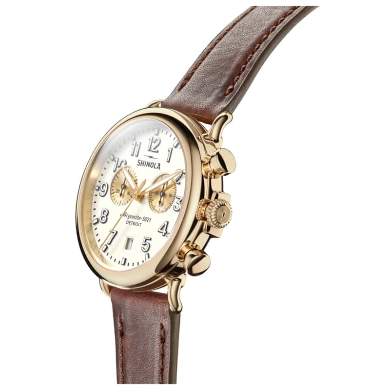 Shinola S0120141502 The Runwell Chrono 41mm Watch w/ Ivory Dial & Cattail Leather StrapPut it on for the first time, but feel like you’ve had it forever. With a polished gold PVD case and two gold-toned sub dials, this 41mm Runwell Chrono is a timepiece that has a generational appeal. Its warm matte ivory velvet dial is punctuated by a calendar aperture and gold-toned Super-LumiNova hands. A rich cattail brown leather strap adds even more character to this casually captivating timepiece. Features